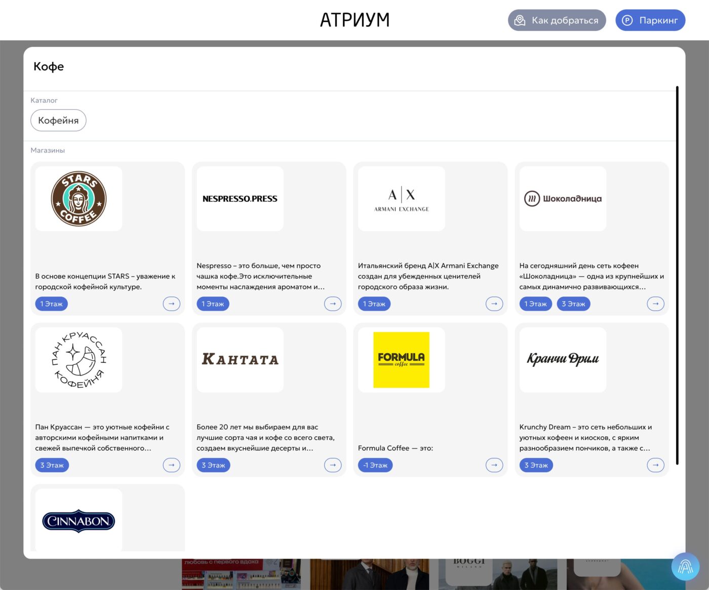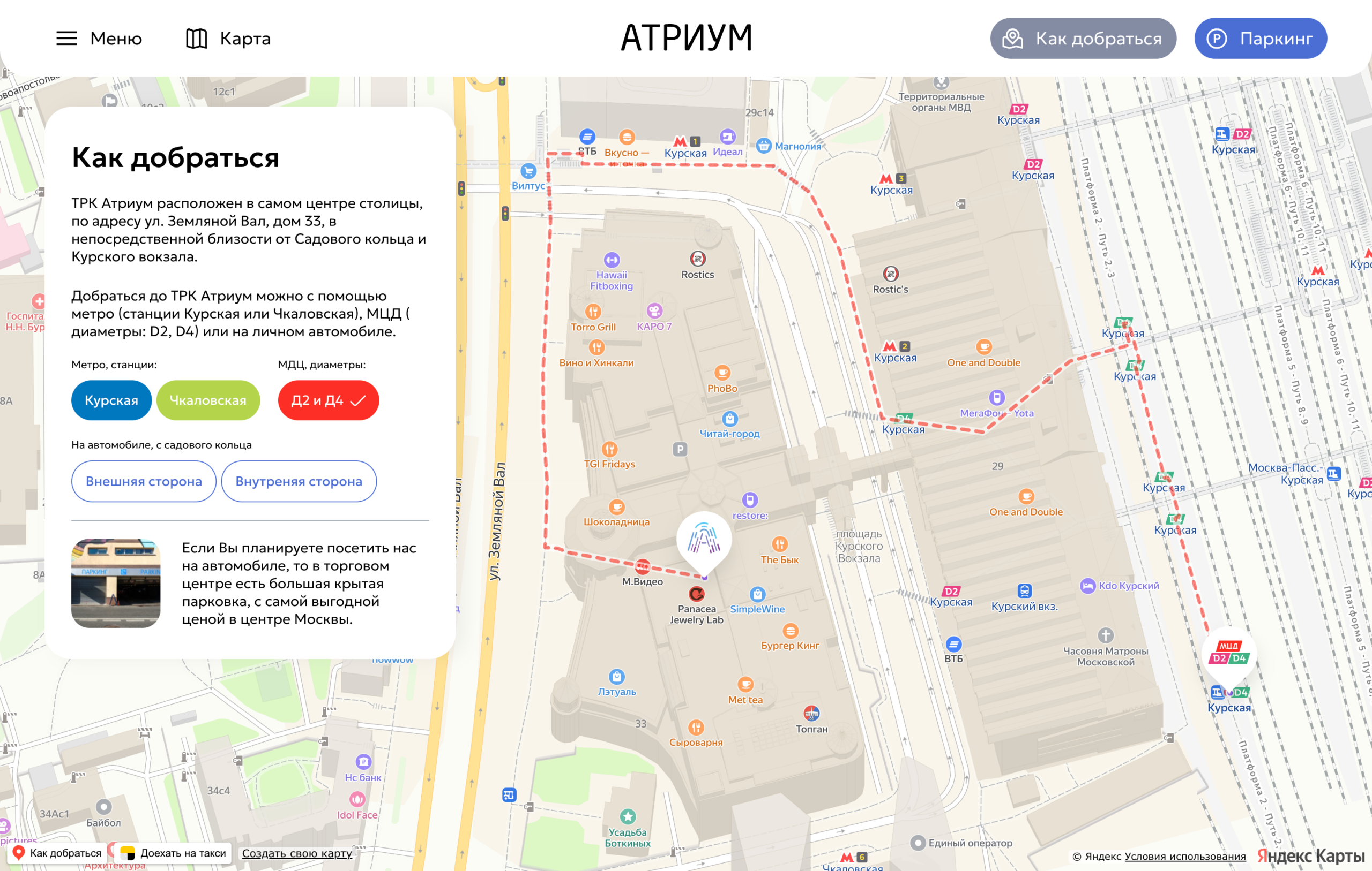 Создали сайт торгово‑развлекательного комплекса «Атриум» с базовым функционалом: интерактивной схемой ТРК, информацией о том, как доехать, и каталогом всех арендаторов.