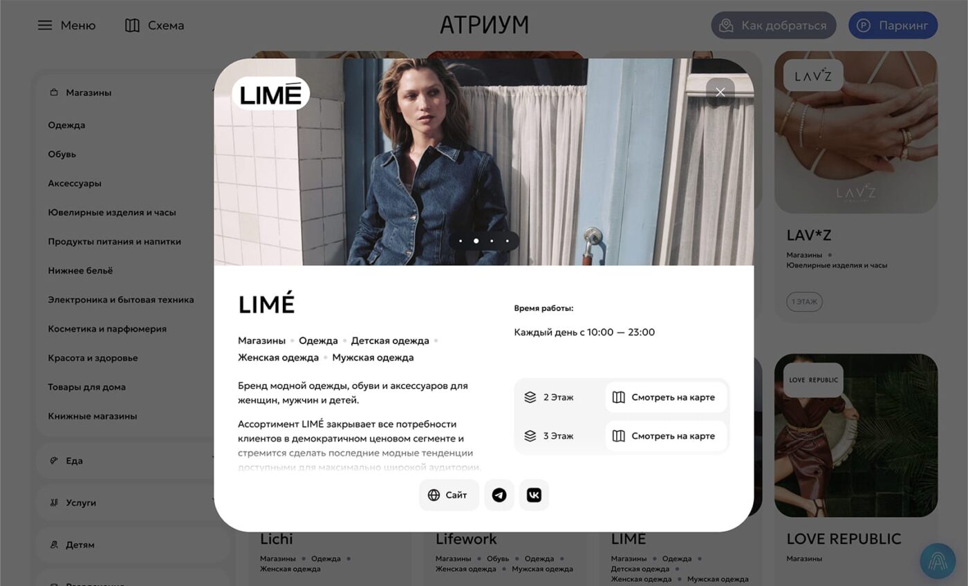 Основной и самый важный раздел сайта ТРК «Атриум» — каталог арендаторов. Для него мы разработали понятную структуру с простой фильтрацией и удобным, быстрым поиском, чтобы посетители легко находили нужные магазины и услуги.