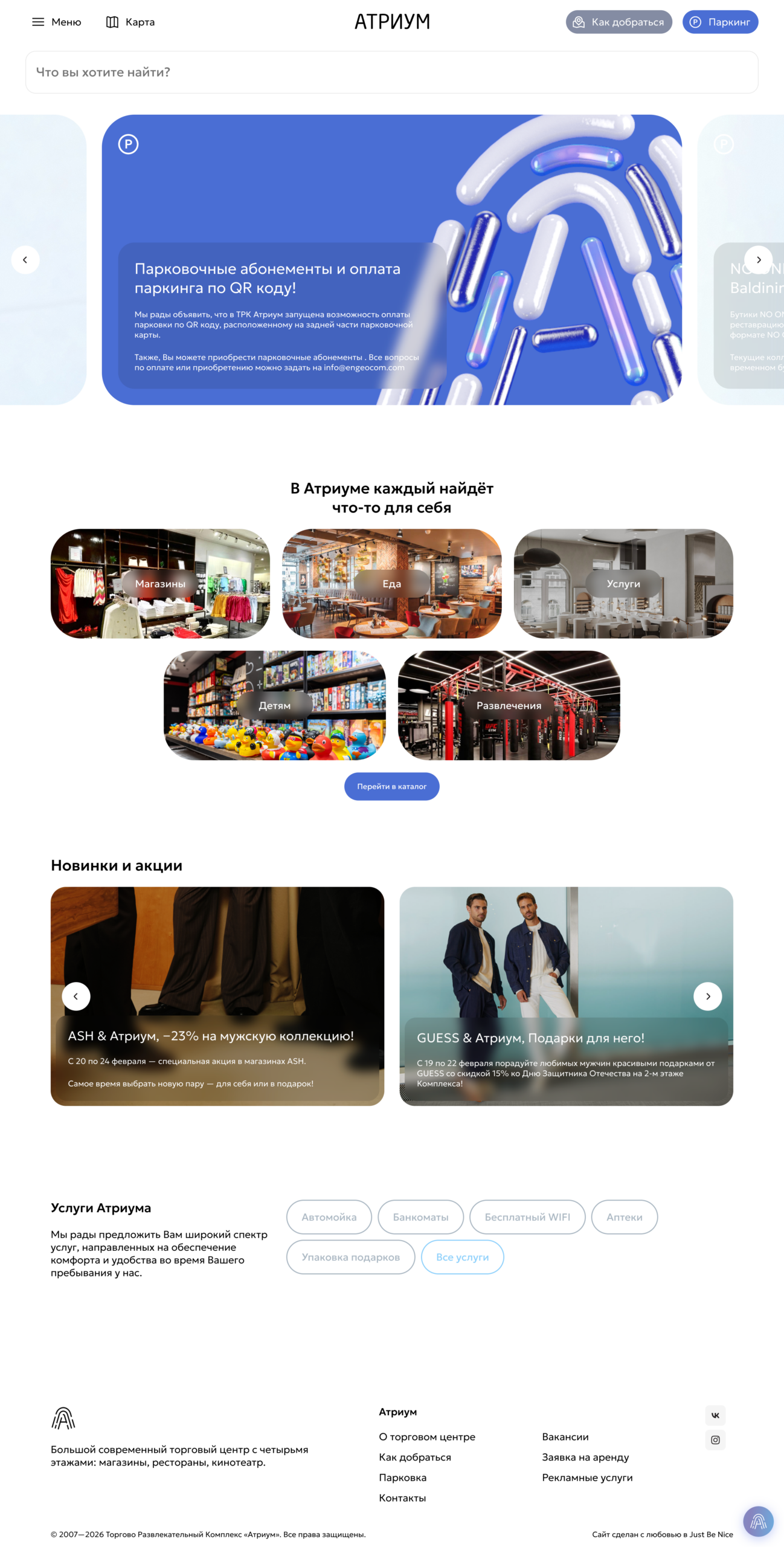 Нам было сложно поверить, но у ТРК «Атриум», существующего с 2002 года, не было полноценного сайта. Клиент не планировал обновлять фирменный стиль, а сайт нужно было запустить в ближайшее время.